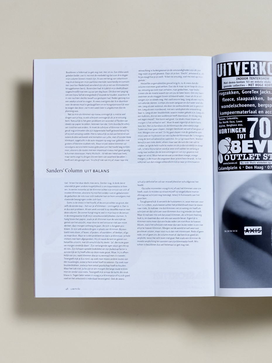 Limits is het magazine voor sportklimmers en alpinisten. Voor dit magazine schreef ik gedurende 5 jaar lang een column in de vorm van een verhaal (en soms een lang gedicht).